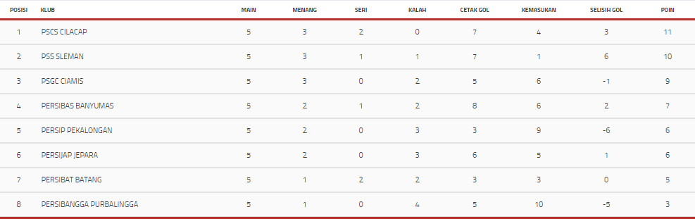 Klasemen akhir liga 2 dan daftar tim yang lolos ke babak 8 besar.
